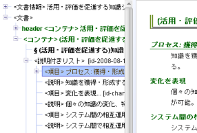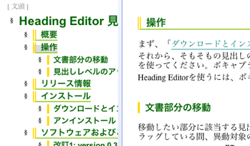 見出しエディターは、コンテナによるグルーピングにかかわらず、見出しだけに基づいて章節構成を表示し、章の入れ替えなどの編集を可能にしています。上の例の文書は、章節の構成にコンテナを使っていませんが、それにもかかわらず、章節構成をインデントで示しています。