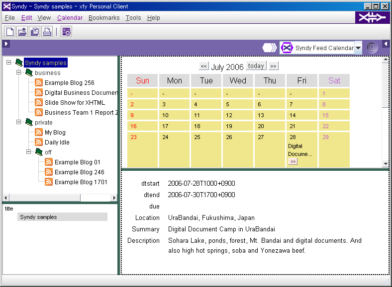 It derives event information from entry documents included in a Atom's feed document and displays them in a monthly calendar. Each event is marked up with hCalendar and embeded in a content element of an entry document, while "hCalendar via RSS XVCD" derives each event information from an XHTML page which are linked from an entry document.