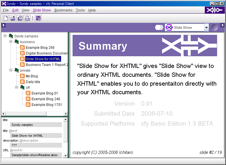 Syndy is a feed application launcher with OPML, and OPML editor. You can apply applications (vocabulary components on xfy) to a group of RSS/Atom feeds and XHTML documents.
